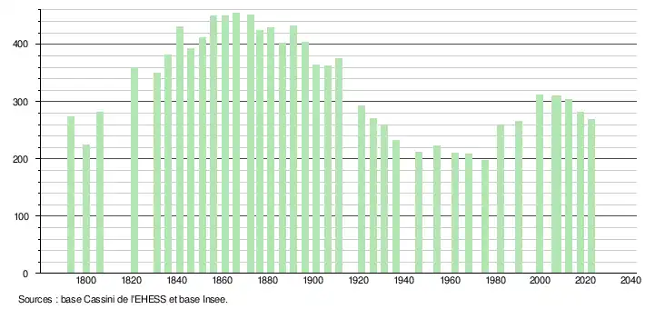 L'évolution du nombre d'habitants est connue à travers les recensements de la population effectués dans la commune depuis 1793. Pour les communes de moins de 10 000 habitants, une enquête de recensement portant sur toute la population est réalisée tous les cinq ans, les populations de référence des années intermédiaires étant quant à elles estimées par interpolation ou extrapolation[17]. Pour la commune, le premier recensement exhaustif entrant dans le cadre du nouveau dispositif a été réalisé en 2007[18].