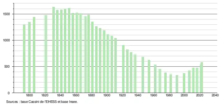 L'évolution du nombre d'habitants est connue à travers les recensements de la population effectués dans la commune depuis 1793. Pour les communes de moins de 10 000 habitants, une enquête de recensement portant sur toute la population est réalisée tous les cinq ans, les populations de référence des années intermédiaires étant quant à elles estimées par interpolation ou extrapolation[32]. Pour la commune, le premier recensement exhaustif entrant dans le cadre du nouveau dispositif a été réalisé en 2006[33].