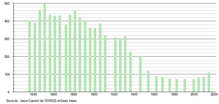 - ↑ Par convention dans Wikipédia, le principe a été retenu de n’afficher dans le tableau des recensements et le graphique, pour les populations légales postérieures à 1999, que les populations correspondant à une enquête exhaustive de recensement pour les communes de moins de 10 000 habitants, et que les populations des années 2006, 2011, 2016, etc. pour les communes de plus de 10 000 habitants, ainsi que la dernière population légale publiée par l’Insee pour l'ensemble des communes.