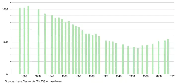 - ↑ Par convention dans Wikipédia, le principe a été retenu de n’afficher dans le tableau des recensements et le graphique, pour les populations légales postérieures à 1999, que les populations correspondant à une enquête exhaustive de recensement pour les communes de moins de 10 000 habitants, et que les populations des années 2006, 2011, 2016, etc. pour les communes de plus de 10 000 habitants, ainsi que la dernière population légale publiée par l’Insee pour l'ensemble des communes.