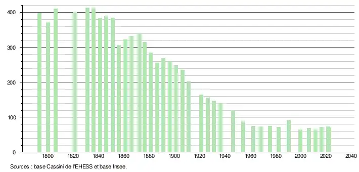 L'évolution du nombre d'habitants est connue à travers les recensements de la population effectués dans la commune depuis 1793. Pour les communes de moins de 10 000 habitants, une enquête de recensement portant sur toute la population est réalisée tous les cinq ans, les populations de référence des années intermédiaires étant quant à elles estimées par interpolation ou extrapolation[17]. Pour la commune, le premier recensement exhaustif entrant dans le cadre du nouveau dispositif a été réalisé en 2006[18].