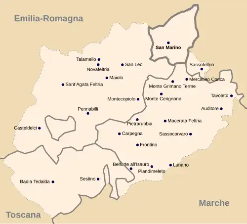La structure architecturale la plus imposante est sans doute la forteresse de San Leo, construite au sommet d'un éperon rocheux. On trouve également dans la région les forteresses de Belforte all'Isauro et Sassocorvaro, dues en partie, comme celle de San Leo, à l'architecte de la Renaissance Francesco di Giorgio Martini. Les châteaux de Monte Cerignone, Serravalle ou la Rocca Fregoso à Sant'Agata Feltria sont d'autres exemples de la florissante architecture militaire médiévale du Montefeltro. Certains de ces édifices sont associés aux noms des familles nobles locales, ainsi le château des princes de Carpegna dans le village éponyme, celui des comtes d'Oliva à Piandimeleto ou celui des comtes de Petrangolini à Tavoleto. À noter enfin les trois tours de Saint-Marin, emblématiques de cette ancienne République.