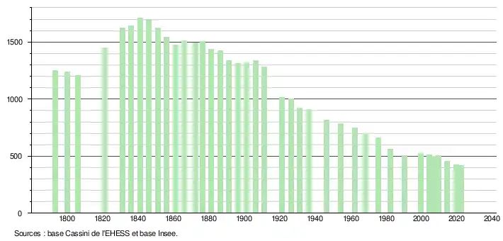 L'évolution du nombre d'habitants est connue à travers les recensements de la population effectués dans la commune depuis 1793. Pour les communes de moins de 10 000 habitants, une enquête de recensement portant sur toute la population est réalisée tous les cinq ans, les populations de référence des années intermédiaires étant quant à elles estimées par interpolation ou extrapolation[22]. Pour la commune, le premier recensement exhaustif entrant dans le cadre du nouveau dispositif a été réalisé en 2004[23].