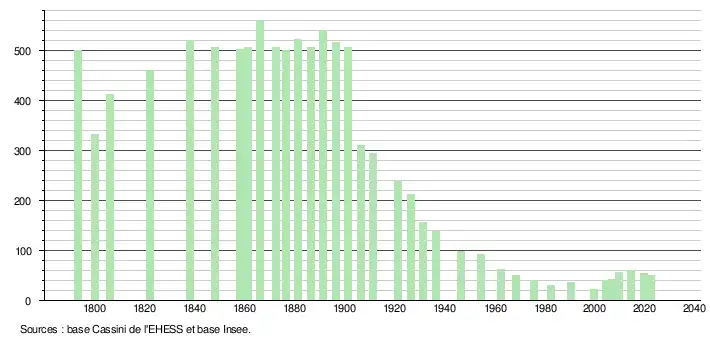 L'évolution du nombre d'habitants est connue à travers les recensements de la population effectués dans la commune depuis 1793. Pour les communes de moins de 10 000 habitants, une enquête de recensement portant sur toute la population est réalisée tous les cinq ans, les populations de référence des années intermédiaires étant quant à elles estimées par interpolation ou extrapolation[14]. Pour la commune, le premier recensement exhaustif entrant dans le cadre du nouveau dispositif a été réalisé en 2004[15].