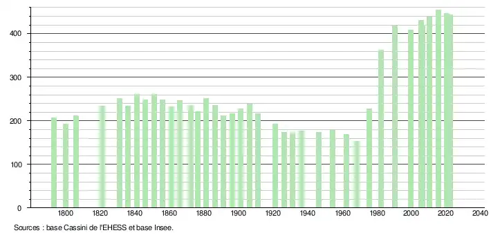 L'évolution du nombre d'habitants est connue à travers les recensements de la population effectués dans la commune depuis 1793. Pour les communes de moins de 10 000 habitants, une enquête de recensement portant sur toute la population est réalisée tous les cinq ans, les populations de référence des années intermédiaires étant quant à elles estimées par interpolation ou extrapolation[31]. Pour la commune, le premier recensement exhaustif entrant dans le cadre du nouveau dispositif a été réalisé en 2005[32].