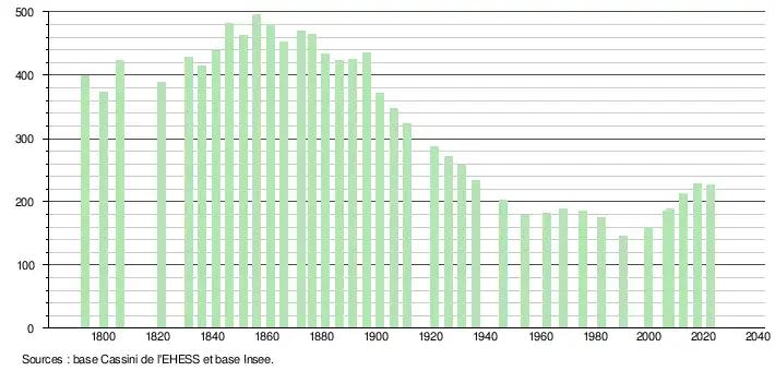L'évolution du nombre d'habitants est connue à travers les recensements de la population effectués dans la commune depuis 1793. Pour les communes de moins de 10 000 habitants, une enquête de recensement portant sur toute la population est réalisée tous les cinq ans, les populations de référence des années intermédiaires étant quant à elles estimées par interpolation ou extrapolation[20]. Pour la commune, le premier recensement exhaustif entrant dans le cadre du nouveau dispositif a été réalisé en 2007[21].