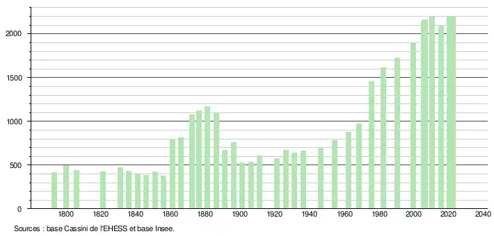 L'évolution du nombre d'habitants est connue à travers les recensements de la population effectués dans la commune depuis 1793. Pour les communes de moins de 10 000 habitants, une enquête de recensement portant sur toute la population est réalisée tous les cinq ans, les populations de référence des années intermédiaires étant quant à elles estimées par interpolation ou extrapolation[19]. Pour la commune, le premier recensement exhaustif entrant dans le cadre du nouveau dispositif a été réalisé en 2005[20].