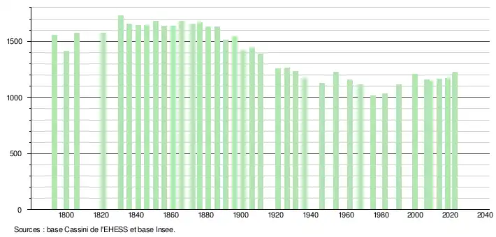 | L'évolution du nombre d'habitants est connue à travers les recensements de la population effectués dans la commune depuis 1793. Pour les communes de moins de 10 000 habitants, une enquête de recensement portant sur toute la population est réalisée tous les cinq ans, les populations de référence des années intermédiaires étant quant à elles estimées par interpolation ou extrapolation[27]. Pour la commune, le premier recensement exhaustif entrant dans le cadre du nouveau dispositif a été réalisé en 2008[28]. En 2022, la commune comptait 1 223 habitants[Note 2], en évolution de +3,38 % par rapport à 2016 (Landes : +5,78 %, France hors Mayotte : +2,11 %). |