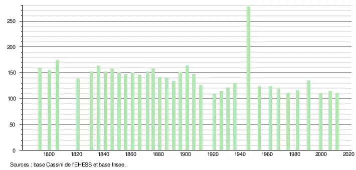 - ↑ Par convention dans Wikipédia, le principe a été retenu de n’afficher dans le tableau des recensements et le graphique, pour les populations légales postérieures à 1999, que les populations correspondant à une enquête exhaustive de recensement pour les communes de moins de 10 000 habitants, et que les populations des années 2006, 2011, 2016, etc. pour les communes de plus de 10 000 habitants, ainsi que la dernière population légale publiée par l’Insee pour l'ensemble des communes.