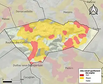 Le retrait-gonflement des sols argileux est susceptible d'engendrer des dommages importants aux bâtiments en cas d’alternance de périodes de sécheresse et de pluie. 66,7 % de la superficie communale est en aléa moyen ou fort (75,2 % au niveau départemental et 48,5 % au niveau national). Sur les 60 bâtiments dénombrés sur la commune en 2019, 59 sont en aléa moyen ou fort, soit 98 %, à comparer aux 94 % au niveau départemental et 54 % au niveau national. Une cartographie de l'exposition du territoire national au retrait gonflement des sols argileux est disponible sur le site du BRGM[29],[Carte 3].