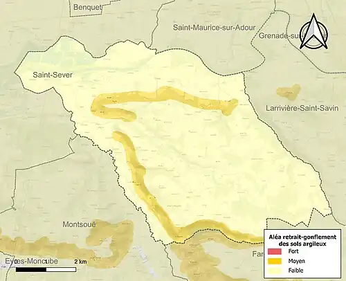 Le retrait-gonflement des sols argileux est susceptible d'engendrer des dommages importants aux bâtiments en cas d’alternance de périodes de sécheresse et de pluie. 12,5 % de la superficie communale est en aléa moyen ou fort (19,2 % au niveau départemental et 48,5 % au niveau national). Sur les 276 bâtiments dénombrés sur la commune en 2019, 14 sont en aléa moyen ou fort, soit 5 %, à comparer aux 17 % au niveau départemental et 54 % au niveau national. Une cartographie de l'exposition du territoire national au retrait gonflement des sols argileux est disponible sur le site du BRGM[19],[Carte 2].