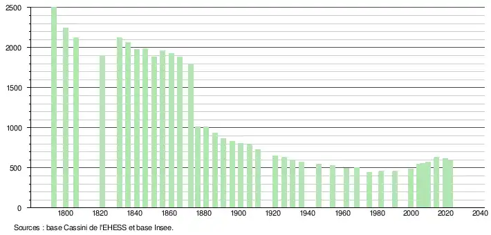 L'évolution du nombre d'habitants est connue à travers les recensements de la population effectués dans la commune depuis 1793. Pour les communes de moins de 10 000 habitants, une enquête de recensement portant sur toute la population est réalisée tous les cinq ans, les populations de référence des années intermédiaires étant quant à elles estimées par interpolation ou extrapolation[21]. Pour la commune, le premier recensement exhaustif entrant dans le cadre du nouveau dispositif a été réalisé en 2004[22].