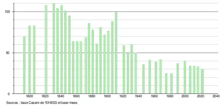 L'évolution du nombre d'habitants est connue à travers les recensements de la population effectués dans la commune depuis 1793. Pour les communes de moins de 10 000 habitants, une enquête de recensement portant sur toute la population est réalisée tous les cinq ans, les populations de référence des années intermédiaires étant quant à elles estimées par interpolation ou extrapolation[27]. Pour la commune, le premier recensement exhaustif entrant dans le cadre du nouveau dispositif a été réalisé en 2006[28].