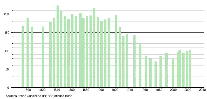 L'évolution du nombre d'habitants est connue à travers les recensements de la population effectués dans la commune depuis 1793. Pour les communes de moins de 10 000 habitants, une enquête de recensement portant sur toute la population est réalisée tous les cinq ans, les populations de référence des années intermédiaires étant quant à elles estimées par interpolation ou extrapolation[21]. Pour la commune, le premier recensement exhaustif entrant dans le cadre du nouveau dispositif a été réalisé en 2008[22].