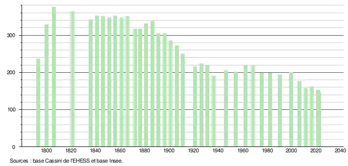 L'évolution du nombre d'habitants est connue à travers les recensements de la population effectués dans la commune depuis 1793. Pour les communes de moins de 10 000 habitants, une enquête de recensement portant sur toute la population est réalisée tous les cinq ans, les populations de référence des années intermédiaires étant quant à elles estimées par interpolation ou extrapolation[13]. Pour la commune, le premier recensement exhaustif entrant dans le cadre du nouveau dispositif a été réalisé en 2006[14].