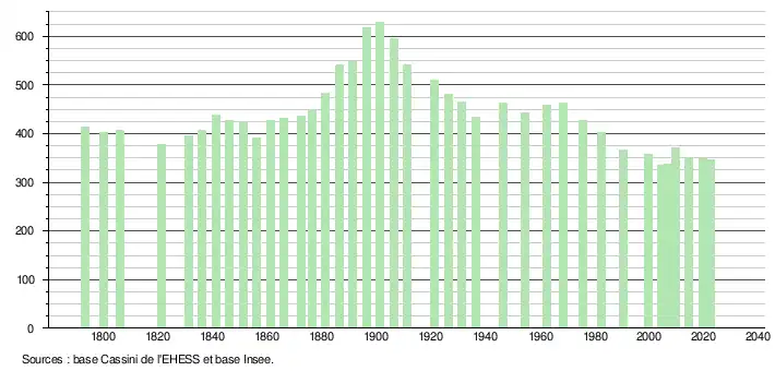 L'évolution du nombre d'habitants est connue à travers les recensements de la population effectués dans la commune depuis 1793. Pour les communes de moins de 10 000 habitants, une enquête de recensement portant sur toute la population est réalisée tous les cinq ans, les populations de référence des années intermédiaires étant quant à elles estimées par interpolation ou extrapolation[38]. Pour la commune, le premier recensement exhaustif entrant dans le cadre du nouveau dispositif a été réalisé en 2004[39].