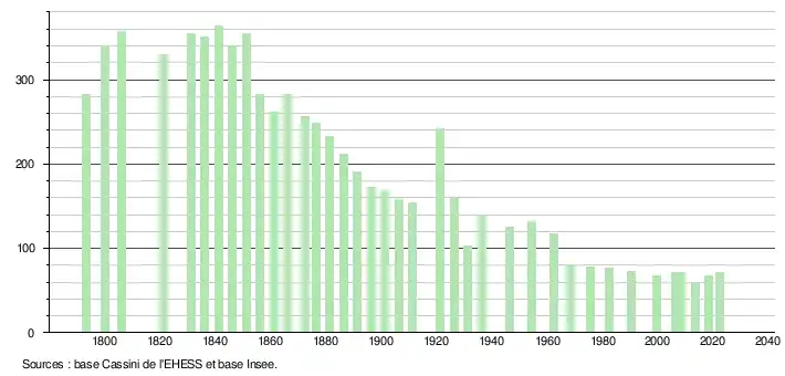 L'évolution du nombre d'habitants est connue à travers les recensements de la population effectués dans la commune depuis 1793. Pour les communes de moins de 10 000 habitants, une enquête de recensement portant sur toute la population est réalisée tous les cinq ans, les populations de référence des années intermédiaires étant quant à elles estimées par interpolation ou extrapolation[20]. Pour la commune, le premier recensement exhaustif entrant dans le cadre du nouveau dispositif a été réalisé en 2008[21].