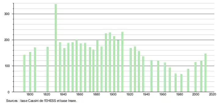 L'évolution du nombre d'habitants est connue à travers les recensements de la population effectués dans la commune depuis 1793. À partir du , les populations légales des communes sont publiées annuellement dans le cadre d'un recensement qui repose désormais sur une collecte d'information annuelle, concernant successivement tous les territoires communaux au cours d'une période de cinq ans. Pour les communes de moins de 10 000 habitants, une enquête de recensement portant sur toute la population est réalisée tous les cinq ans, les populations légales des années intermédiaires étant quant à elles estimées par interpolation ou extrapolation[5]. Pour la commune, le premier recensement exhaustif entrant dans le cadre du nouveau dispositif a été réalisé en 2006[6],[Note 1].