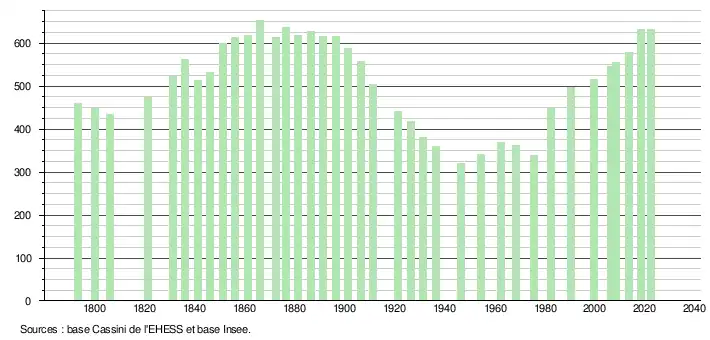 L'évolution du nombre d'habitants est connue à travers les recensements de la population effectués dans la commune depuis 1793. Pour les communes de moins de 10 000 habitants, une enquête de recensement portant sur toute la population est réalisée tous les cinq ans, les populations de référence des années intermédiaires étant quant à elles estimées par interpolation ou extrapolation[13]. Pour la commune, le premier recensement exhaustif entrant dans le cadre du nouveau dispositif a été réalisé en 2008[14].