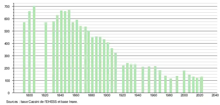 L'évolution du nombre d'habitants est connue à travers les recensements de la population effectués dans la commune depuis 1793. Pour les communes de moins de 10 000 habitants, une enquête de recensement portant sur toute la population est réalisée tous les cinq ans, les populations de référence des années intermédiaires étant quant à elles estimées par interpolation ou extrapolation[16]. Pour la commune, le premier recensement exhaustif entrant dans le cadre du nouveau dispositif a été réalisé en 2006[17].