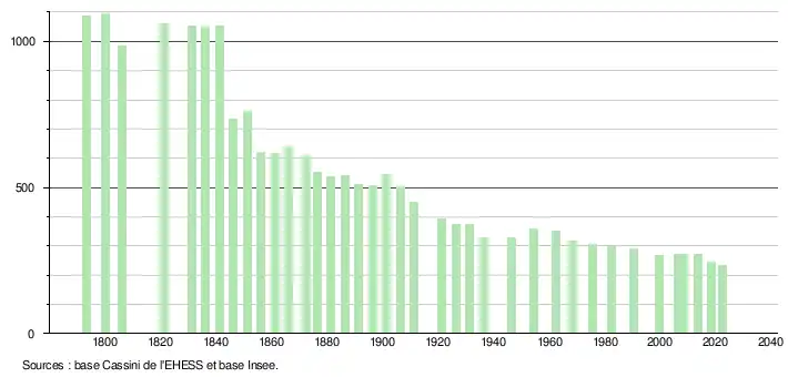 L'évolution du nombre d'habitants est connue à travers les recensements de la population effectués dans la commune depuis 1793. Pour les communes de moins de 10 000 habitants, une enquête de recensement portant sur toute la population est réalisée tous les cinq ans, les populations de référence des années intermédiaires étant quant à elles estimées par interpolation ou extrapolation[16]. Pour la commune, le premier recensement exhaustif entrant dans le cadre du nouveau dispositif a été réalisé en 2008[17].