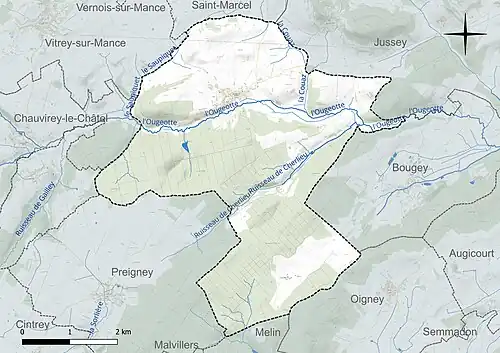 Le village est limitrophe des communes de Melin, Oigney, Preigney, Bougey, Saint-Marcel, Vitrey-sur-Mance, Chauvirey-le-Châtel, Chauvirey-le-Vieil et du village de Noroy-lès-Jussey, désormais rattaché à la commune de Jussey.