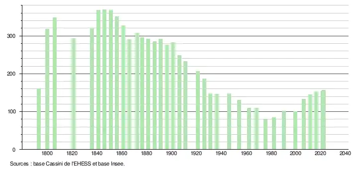 L'évolution du nombre d'habitants est connue à travers les recensements de la population effectués dans la commune depuis 1793. Pour les communes de moins de 10 000 habitants, une enquête de recensement portant sur toute la population est réalisée tous les cinq ans, les populations de référence des années intermédiaires étant quant à elles estimées par interpolation ou extrapolation[13]. Pour la commune, le premier recensement exhaustif entrant dans le cadre du nouveau dispositif a été réalisé en 2006[14].