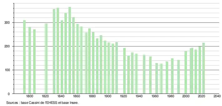 L'évolution du nombre d'habitants est connue à travers les recensements de la population effectués dans la commune depuis 1793. Pour les communes de moins de 10 000 habitants, une enquête de recensement portant sur toute la population est réalisée tous les cinq ans, les populations de référence des années intermédiaires étant quant à elles estimées par interpolation ou extrapolation[15]. Pour la commune, le premier recensement exhaustif entrant dans le cadre du nouveau dispositif a été réalisé en 2007[16].