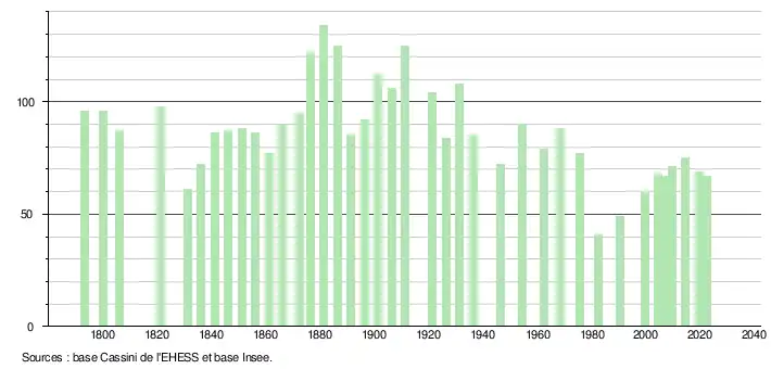- ↑ Population municipale de référence en vigueur au 1er janvier 2025, millésimée 2022, définie dans les limites territoriales en vigueur au 1er janvier 2024, date de référence statistique : 1er janvier 2022.