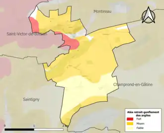 Le retrait-gonflement des sols argileux est susceptible d'engendrer des dommages importants aux bâtiments en cas d’alternance de périodes de sécheresse et de pluie. 73,6 % de la superficie communale est en aléa moyen ou fort (52,8 % au niveau départemental et 48,5 % au niveau national). Sur les 154 bâtiments dénombrés sur la commune en 2019, 133 sont en aléa moyen ou fort, soit 86 %, à comparer aux 70 % au niveau départemental et 54 % au niveau national. Une cartographie de l'exposition du territoire national au retrait gonflement des sols argileux est disponible sur le site du BRGM[17],[Carte 2].