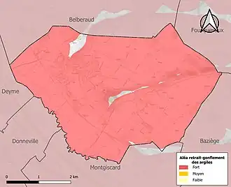 Le retrait-gonflement des sols argileux est susceptible d'engendrer des dommages importants aux bâtiments en cas d’alternance de périodes de sécheresse et de pluie. 98,1 % de la superficie communale est en aléa moyen ou fort (88,8 % au niveau départemental et 48,5 % au niveau national). Sur les 597 bâtiments dénombrés sur la commune en 2019, 593 sont en aléa moyen ou fort, soit 99 %, à comparer aux 98 % au niveau départemental et 54 % au niveau national. Une cartographie de l'exposition du territoire national au retrait gonflement des sols argileux est disponible sur le site du BRGM[22],[Carte 3].