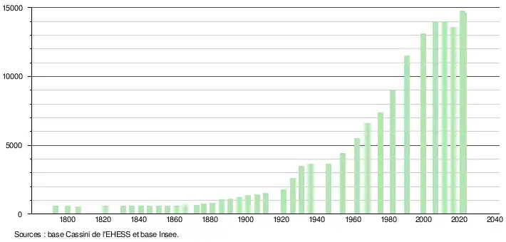 4. Par convention dans Wikipédia, le principe a été retenu de n’afficher dans le tableau des recensements et le graphique, pour les populations de référence postérieures à 1999, que les populations correspondant à une enquête exhaustive de recensement pour les communes de moins de 10 000 habitants, et que les populations des années 2006, 2011, 2016, etc. pour les communes de plus de 10 000 habitants, ainsi que la dernière population de référence publiée par l’Insee pour l'ensemble des communes.