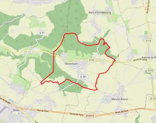 - ↑ « Orthodromie entre Montmain et Boos », sur fr.distance.to (consulté le ).