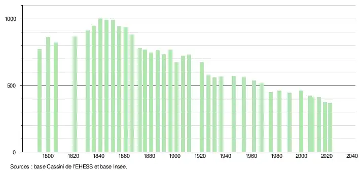 L'évolution du nombre d'habitants est connue à travers les recensements de la population effectués dans la commune depuis 1793. Pour les communes de moins de 10 000 habitants, une enquête de recensement portant sur toute la population est réalisée tous les cinq ans, les populations de référence des années intermédiaires étant quant à elles estimées par interpolation ou extrapolation[19]. Pour la commune, le premier recensement exhaustif entrant dans le cadre du nouveau dispositif a été réalisé en 2008[20].