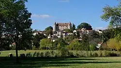 La ville est surmontée par le château (propriété privée) datant du Moyen Âge. L'ensemble des bâtiments, y compris la chapelle, située dans les jardins, est classé monument historique depuis 1952[29]. Son enceinte daterait du XIe siècle, le château a été détruit durant la guerre de Cent Ans, il n'en reste qu'une porte monumentale et le château actuel a été rebâti sur les remblais au XVe siècle sous forme d'un manoir à l'abri de ses enceintes.