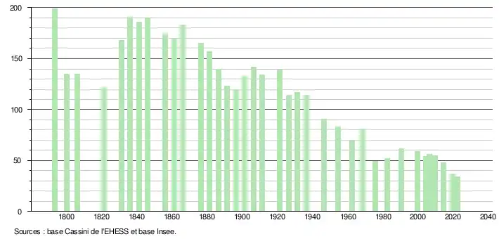 L'évolution du nombre d'habitants est connue à travers les recensements de la population effectués dans la commune depuis 1793. Pour les communes de moins de 10 000 habitants, une enquête de recensement portant sur toute la population est réalisée tous les cinq ans, les populations de référence des années intermédiaires étant quant à elles estimées par interpolation ou extrapolation[31]. Pour la commune, le premier recensement exhaustif entrant dans le cadre du nouveau dispositif a été réalisé en 2004[32].