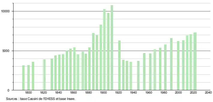 L'évolution du nombre d'habitants est connue à travers les recensements de la population effectués dans la commune depuis 1793. Pour les communes de moins de 10 000 habitants, une enquête de recensement portant sur toute la population est réalisée tous les cinq ans, les populations de référence des années intermédiaires étant quant à elles estimées par interpolation ou extrapolation[35]. Pour la commune, le premier recensement exhaustif entrant dans le cadre du nouveau dispositif a été réalisé en 2006[36].