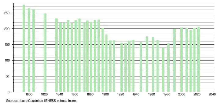 L'évolution du nombre d'habitants est connue à travers les recensements de la population effectués dans la commune depuis 1793. Pour les communes de moins de 10 000 habitants, une enquête de recensement portant sur toute la population est réalisée tous les cinq ans, les populations de référence des années intermédiaires étant quant à elles estimées par interpolation ou extrapolation[12]. Pour la commune, le premier recensement exhaustif entrant dans le cadre du nouveau dispositif a été réalisé en 2006[13].