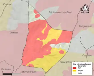 Le retrait-gonflement des sols argileux est susceptible d'engendrer des dommages importants aux bâtiments en cas d’alternance de périodes de sécheresse et de pluie. 87,9 % de la superficie communale est en aléa moyen ou fort (67,5 % au niveau départemental et 48,5 % au niveau national). Sur les 489 bâtiments dénombrés sur la commune en 2019, 428 sont en aléa moyen ou fort, soit 88 %, à comparer aux 90 % au niveau départemental et 54 % au niveau national. Une cartographie de l'exposition du territoire national au retrait gonflement des sols argileux est disponible sur le site du BRGM[21],[Carte 2].