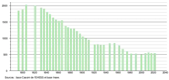 L'évolution du nombre d'habitants est connue à travers les recensements de la population effectués dans la commune depuis 1793. Pour les communes de moins de 10 000 habitants, une enquête de recensement portant sur toute la population est réalisée tous les cinq ans, les populations de référence des années intermédiaires étant quant à elles estimées par interpolation ou extrapolation[35]. Pour la commune, le premier recensement exhaustif entrant dans le cadre du nouveau dispositif a été réalisé en 2006[36].