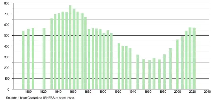 L'évolution du nombre d'habitants est connue à travers les recensements de la population effectués dans la commune depuis 1793. Pour les communes de moins de 10 000 habitants, une enquête de recensement portant sur toute la population est réalisée tous les cinq ans, les populations de référence des années intermédiaires étant quant à elles estimées par interpolation ou extrapolation[16]. Pour la commune, le premier recensement exhaustif entrant dans le cadre du nouveau dispositif a été réalisé en 2006[17].