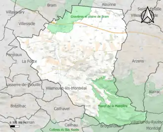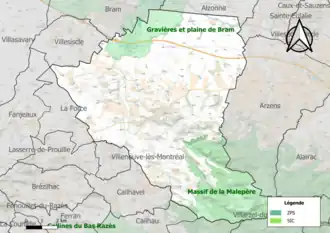 L’inventaire des zones naturelles d'intérêt écologique, faunistique et floristique (ZNIEFF) a pour objectif de réaliser une couverture des zones les plus intéressantes sur le plan écologique, essentiellement dans la perspective d’améliorer la connaissance du patrimoine naturel national et de fournir aux différents décideurs un outil d’aide à la prise en compte de l’environnement dans l’aménagement du territoire. Deux ZNIEFF de type 1[Note 2] sont recensées sur la commune[17] : les « gravières et plaine de Bram » (2 381 ha), couvrant 6 communes du département[18], et le « massif de la Malepère » (5 883 ha), couvrant 14 communes du département[19].