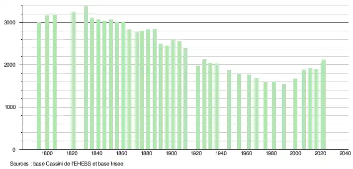 L'évolution du nombre d'habitants est connue à travers les recensements de la population effectués dans la commune depuis 1793. Pour les communes de moins de 10 000 habitants, une enquête de recensement portant sur toute la population est réalisée tous les cinq ans, les populations de référence des années intermédiaires étant quant à elles estimées par interpolation ou extrapolation[29]. Pour la commune, le premier recensement exhaustif entrant dans le cadre du nouveau dispositif a été réalisé en 2006[30].