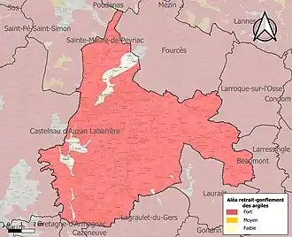 Le retrait-gonflement des sols argileux est susceptible d'engendrer des dommages importants aux bâtiments en cas d’alternance de périodes de sécheresse et de pluie. 95,2 % de la superficie communale est en aléa moyen ou fort (94,5 % au niveau départemental et 48,5 % au niveau national). Sur les 736 bâtiments dénombrés sur la commune en 2019, 686 sont en aléa moyen ou fort, soit 93 %, à comparer aux 93 % au niveau départemental et 54 % au niveau national. Une cartographie de l'exposition du territoire national au retrait gonflement des sols argileux est disponible sur le site du BRGM[25],[Carte 3].