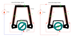 La variante à bobine fixe est commercialisée en 1958 par Lip, avec le calibre R27. L'une des premières montres équipées de ce mouvement est offerte au général de Gaulle[10]. Le schéma à la droite présente les deux étapes du fonctionnement du balancier du mouvement R27. Dans le dessin de gauche, le circuit électrique est ouvert, et le balancier suit son mouvement, entraîné par le ressort spiral (non représenté). Dans le dessin de droite, pour une certaine position du balancier, la plaquette solidaire du balancier a déformé le fil de contact, fermant le circuit. Les deux bobines agissent alors comme des électroaimants. L'ensemble formé par le cœur magnétique et le balancier forment alors un circuit magnétique, et un couple est exercé sur le balancier, car il tend à se placer horizontalement pour maximiser le flux magnétique. Une diode permet d'éviter une décharge électrique trop violente lorsque le circuit se rouvre, l'inductance créant alors une surtension[11].