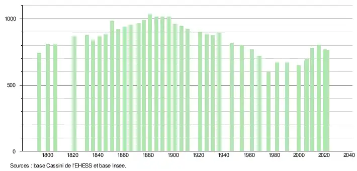 L'évolution du nombre d'habitants est connue à travers les recensements de la population effectués dans la commune depuis 1793. Pour les communes de moins de 10 000 habitants, une enquête de recensement portant sur toute la population est réalisée tous les cinq ans, les populations de référence des années intermédiaires étant quant à elles estimées par interpolation ou extrapolation[18]. Pour la commune, le premier recensement exhaustif entrant dans le cadre du nouveau dispositif a été réalisé en 2005[19].