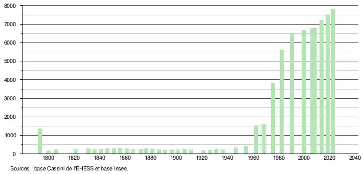 L'évolution du nombre d'habitants est connue à travers les recensements de la population effectués dans la commune depuis 1793. Pour les communes de moins de 10 000 habitants, une enquête de recensement portant sur toute la population est réalisée tous les cinq ans, les populations de référence des années intermédiaires étant quant à elles estimées par interpolation ou extrapolation[28]. Pour la commune, le premier recensement exhaustif entrant dans le cadre du nouveau dispositif a été réalisé en 2008[29].