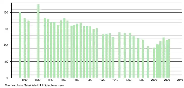 L'évolution du nombre d'habitants est connue à travers les recensements de la population effectués dans la commune depuis 1793. Pour les communes de moins de 10 000 habitants, une enquête de recensement portant sur toute la population est réalisée tous les cinq ans, les populations de référence des années intermédiaires étant quant à elles estimées par interpolation ou extrapolation[24]. Pour la commune, le premier recensement exhaustif entrant dans le cadre du nouveau dispositif a été réalisé en 2004[25].
