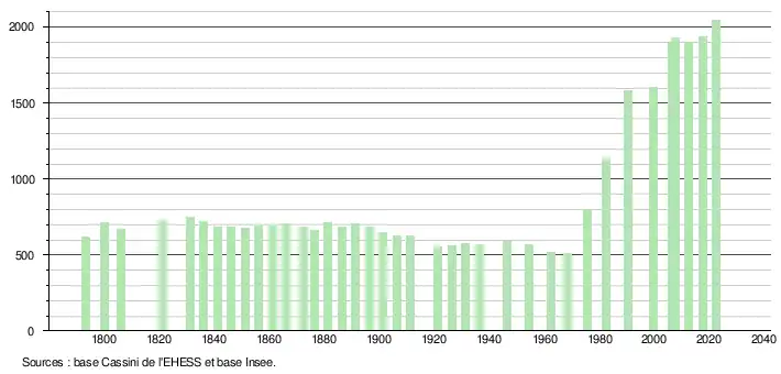 L'évolution du nombre d'habitants est connue à travers les recensements de la population effectués dans la commune depuis 1793. Pour les communes de moins de 10 000 habitants, une enquête de recensement portant sur toute la population est réalisée tous les cinq ans, les populations de référence des années intermédiaires étant quant à elles estimées par interpolation ou extrapolation[23]. Pour la commune, le premier recensement exhaustif entrant dans le cadre du nouveau dispositif a été réalisé en 2007[24].