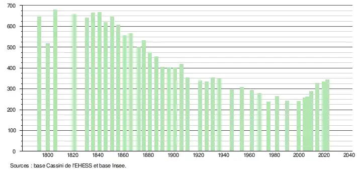 L'évolution du nombre d'habitants est connue à travers les recensements de la population effectués dans la commune depuis 1793. Pour les communes de moins de 10 000 habitants, une enquête de recensement portant sur toute la population est réalisée tous les cinq ans, les populations de référence des années intermédiaires étant quant à elles estimées par interpolation ou extrapolation[20]. Pour la commune, le premier recensement exhaustif entrant dans le cadre du nouveau dispositif a été réalisé en 2004[21].